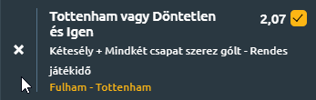 - A két gárda között azért van minőségbeli különbség a Tottenham javára, ezt most megfejeli a lendület, amivel érkeznek. Persze a Fulham is jó lesz minimum egy gólra, de a Tottenham folytathatja a jó sorozatát és nem kap ki. A tippem X2 és mindkét csapat szerez gólt!