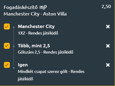 - A Manchester Citynek itt nyernie kell. Az Aston Villa legyőzte a Wolves-t, de azon a meccsen nem játszott különösebben jól. A City számára fontos lesz, hogy megnyerje ezt a meccset és újabb győzelmi sorozatot kezdjen, mert jön a hajrá és csak a bajnoki cím az elfogadható. A hazaiak győzelme vaskos esély és mivel a Villát is képesnek tartom a gólra, bekötöm mellé a mindkét csapat gólt és az over 2,5-et is! Remek szorzót ad.