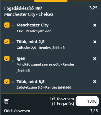 - Mindezek után számomra egyértelmű, hogy a következő fogadáskészítős tippet állítom össze: Manchester City nyer + mindkét csapat szerez gólt és több mint 2,5 gól a meccsen +több mint 8,5 szöglet a mérkőzésen.