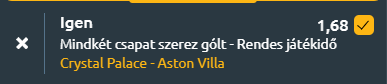 - Jó kis meccs várható a Crystal Palace és az Aston Villa között, mivel mindkét csapatnak megvannak a maga erősségei és gyengeségei. A hazaiak eddig nyolc győzelemmel, kilenc döntetlennel és kilenc vereséggel állnak a bajnokságban, és bár a kiesés miatt nem kell aggódniuk, a gólhiány miatt nem tudtak feljebb kapaszkodni a tabellán. Oliver Glasner csapata három győzelmet szerzett az utóbbi négy meccsén, ám ezek mind idegenben történtek, míg otthon két vereségbe futottak bele. A Selhurst Parkon mindössze két bajnoki sikert arattak idén, ami komoly hátrányt jelenthet a Villa ellen. Ugyanakkor Unai Emery együttese sem a legjobb idegenbeli csapat, hiszen 12 meccs alatt csak 14 pontot szerzett vendégként. A Villa legutóbb fordított a Chelsea ellen, és bár jelenleg nyolcadik, mindössze két pontra van a Bajnokok Ligája-helyektől. Az elmúlt négy meccsükön veretlenek, ráadásul még három fronton versenyben vannak, de a Palace ellen az utóbbi három bajnokijukon nem tudtak nyerni, és legutóbbi látogatásuk során 5-0-s vereséget szenvedtek. A hazai pálya egyik félnek sem jelent komoly előnyt, így egy szoros, gólokban gazdag meccs várható, ahol mindkét fél betalálhat eséllyel!