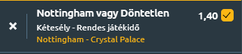 - A Nottingham Forest stabil védekezése és a Palace gyenge támadójátéka miatt a hazai csapat előnyös helyzetben van. Forest eddigi teljesítménye a szezonban azt mutatja, hogy képesek minimalizálni a kapott gólok számát, míg támadásban is rendelkeznek olyan játékosokkal, akik képesek meglepetést okozni. A Crystal Palace gyenge formája és sérülésekkel terhelt csapata esélyt ad a Forestnek arra, hogy hazai pályán megszerezze a győzelmet, különösen, ha kihasználják a Palace védekezésének gyenge pontjait. Nem kap ki a Nottingham.