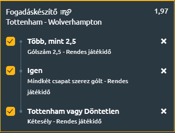 - A Tottenham támadósora továbbra is képes látványos játékra, de a védelmi problémák miatt nehéz megbízható teljesítményt várni tőlük. A Wolves jelenlegi formája és lendülete nagyon jó esélyekkel vendéggólt eredményez majd és a Spurs támadósora is képes lesz gólra-gólokra, különösen haza környezetben. A tipp hármas fogadáskészítős szelvény: Mindkét csapat betalál és lesz legalább három gól, valamint nem kap ki a Tottenham.