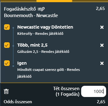 - A Newcastle ma még idegenben is nyomás alá helyezi majd a hazaiakat, akik átengedik a szervezés jogát, és gyors átmenetekkel próbálnak eljutni a vendégkapuig. Nyílt támadófocit, izgalmas meccset várhatunk, ahol mindkét csapat szerez gólt, minimum három találat lesz és a döntetlen mellett a vendégsiker az esélyes.