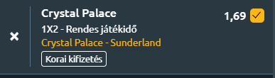 Egy Single Value Tipp következik, vagyis a sportfogadásban egy olyan értékelhető szorzó, amely single játékba küldés esetén is értéket hordoz magában! Londonban mérkőzik meg egymással a veretlen Crystal Palace és az újoncként remek rajtot vett Sunderland. Parázs meccs várható!
