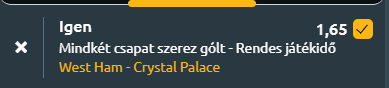- És, hogy mi várható? A két csapat közötti utóbbi találkozók szinte mindig gólokat hoztak! A legutóbbi 15 összecsapásukból 14 alkalommal mindkét fél betalált, és tízszer három vagy több gól született. A West Ham hazai pályán magabiztosabb, míg a Crystal Palace idegenben mutatott formája adhat okot bizakodásra. A legvalószínűbb opció a gólváltás, nem rossz a szorzója egy szelvénytipphez, aki single szeretné játékba küldeni, becsatolhatja az 1X-et, vagy akár a hazai győzelmet is meg lehet kockáztatni. Az úgy már magas szorzót jelent! Én maradok a gólváltásnál. (1-1, 2-1, 2-2)