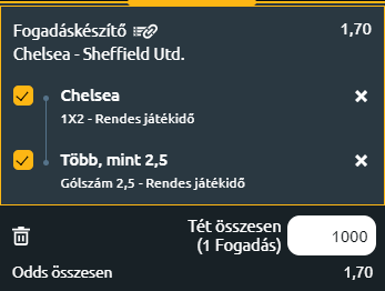 - A forma mindkettőnél egyformán gyenge. Viszont a játékosállomány minősége, a hazai pálya előnye komoly Chelsea-esélyt eredményez. Viszont a Premier Ligában soha egyetlen csapat sem adja fel! Ez a Sheffield is a végsőkig fog küzdeni és mivel a győzelmi kényszerben lévő Chelsea támadni fog, lesz lehetőségük kontrázni! A hazai győzelem mellett az over 2,5 gól is esélyes!