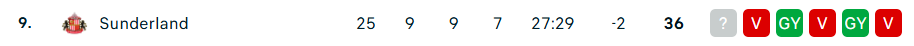 - A szezon kellemes meglepetése az újonc Sunderland, amely a 25. fordulót követően a tabella 9. helyét foglalta el 9 győzelemmel, 9 döntetlennel és 7 vereséggel. A tavaly még a másodosztályban vitézkedő gárda akár nemzetközi kupaszereplésre is reális eséllyel pályázhat, az Európa-liga főtábláját jelentő 5. pozíciótól 7 pont választotta el, mielőtt belecsaptak a csapatok a bajnoki küzdelem újabb menetébe.