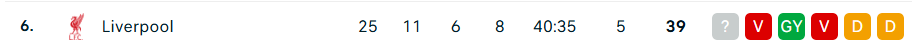 - A Mersey-partiak tehát nem igazán engedhetik meg maguknak az újabb botlást, főleg egy olyan hatmeccses PL-sorozat után, amelyből mindössze egyet nyertek meg – a legutóbbi hazait a Newcastle ellen, 4-1-re – négy döntetlen és két vereség mellett.