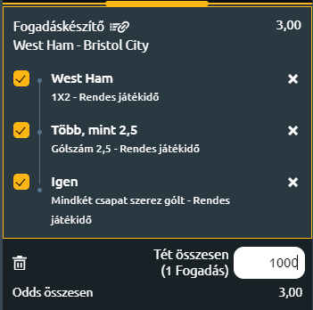 Tipp: West Ham győzelem + Több mint 2,5 gól a mérkőzésen + mindkét csapat szerez gólt