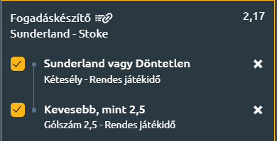 - A Sunderland otthoni formája és támadójátéka döntő lesz. Bár a Stoke védekezése az utóbbi időben stabilnak bizonyult, idegenbeli gyengélkedésük miatt ma kevés esélyük lesz. A Sunderland jelen pillanatban jobb csapat, viszont a két gárda közti minőségi különbség nem olyan nagy, hogy egy döntetlent ne lehessen belegondolni a meccsbe. A vendégek jó védelme miatt pedig a gólszámmal kapcsolatban is érdemes elmélázni. A tippem itt is két elemből áll. Egyrészt az 1X, ami eléggé valószínű, mellé csatolmányként pedig az under 2,5 gól kapcsolódik. A két elegy együtt egy 2,17-es koktélt eredményez!
