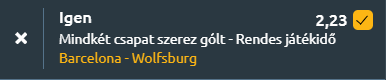 - A Barcelona magabiztos előnyből várja a Wolfsburg elleni visszavágót a Bajnokok Ligája negyeddöntőjében, miután az első mérkőzésen idegenben 4-1-es győzelmet arattak. A katalán csapat célja, hogy a negyedik UWCL-trófeáját szerezze meg az utóbbi öt szezonban, és a visszavágón is egyértelmű esélyesnek számít. Bár a hétvégi El Clásicón 3-1-es vereséget szenvedtek a Real Madrid ellen, továbbra is stabilan vezetik a spanyol bajnokságot, így figyelmüket most ismét a nemzetközi porondra fordíthatják. A Wolfsburg számára rendkívül nehéz feladat lesz háromgólos hátrányból fordítani, főleg, hogy a német csapat formája nem túl meggyőző,legutóbbi öt idegenbeli mérkőzéséből csak egyet nyert meg, és a legutóbbi spanyolországi látogatásán 5-1-es vereséget szenvedett a Barcelonától. A katalánok hazai pályán különösen erősek a Bajnokok Ligájában, hiszen 2012 óta nem kaptak ki három vagy több góllal, ami tovább csökkenti a Wolfsburg esélyeit. Ugyanakkor egy német csapat sosem fog feltartott kezekkel a pályára futni, így a Wolfsburgnak nincs más választása, mint kockáztatni és nyílt játékot vállalni, ha még reménykedni akar a továbbjutásban. A németeknek mindenképp gólt kell szerezniük a gyors kiesés elkerüléséhez, míg a Barcelona szinte biztosan kihasználja majd az így megnyíló területeket. Gólváltás várható, amire nagyon jó szorzót adnak!
