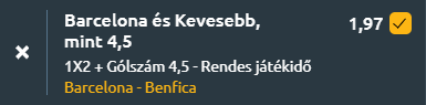 - A találkozón a Barcelona várhatóan dominálni fogja a játékot, és a támadóereje révén esélyes a győzelemre. A Benfica támadósora ugyan képes lehet kihasználni a katalánok magasra tolt védelmi vonalát, de a portugálok védelme sérülékeny lehet egy ilyen kvalitású ellenféllel szemben. Bár a vendégeknek győzniük kell a továbbjutáshoz, a Barcelona hazai pályán túl erős lehet számukra. A Barcelona számára ott van a bagós a kapuban, aki ma is jól fog védeni! Nyer a Barca és nem lesz több, mint 4,5 gól a meccsen!