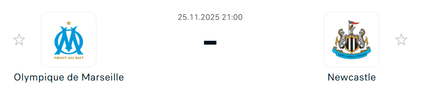 - A Marseille esetében az Atalanta elleni, 89. perces gól okozta 1–0-s hazai vereség fájó sebet hagyott, amely már a harmadik BL-bukásuk volt az idei kiírásban a Sporting és a Real Madrid elleni kudarcok után. Egyetlen sikerük az Ajax ellen jött össze, így a tabella 25. helyén szerénykednek. Ugyanakkor a Ligue 1-ben remekeltek, a válogatott szünet előtt 3–0-ra verték a Brestet, legutóbb pedig 5–1-re gázolták el a Nicét, ahol Mason Greenwood elérte a két számjegyű gólmennyiséget. A csapat tizenkét mérkőzés óta nyeretlen angol ellenfelekkel szemben, bár a Newcastle-t 2003–04-ben 2–0-ra megverték az UEFA-kupa elődöntőjében. A keretből Emerson Palmieri visszatérhet, viszont Pavard és Aguerd sárga esetén eltiltással nézne szembe, utóbbi ráadásul sérüléssel is küzd. Hamed Traore és Amir Murillo szintén kérdéses, Amine Gouiri pedig vállsérülés miatt januárig hiányzik. Aubameyang legutóbb góllal és két gólpasszal villogott. Hojbjerg szereplése bizonytalan, Facundo Medina pedig nem bevethető.