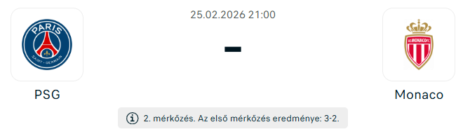 - Az első mérkőzésen a címvédő kétgólos hátrányból fordítva 3–2-re nyert, ezzel is megmutatva, mennyire erős gépezet a PSG. Luis Enrique együttese sorozatban négy kieséses meccset nyert meg a sorozatban, hazai pályán pedig legutóbbi két találkozóját 8–0-s összesítéssel húzta be. A Monaco számára nem ismeretlen a kényszerhelyzet, de az utóbbi három kétmeccses BL-párharcát elbukta, és 2016–17 óta nem jutott a legjobb 16 közé, amikor a fiatal Kylian Mbappé segítette őket az elődöntőig. Idegenben idén négy BL-meccsen összesen 12 gólt kaptak, és csak egyet nyertek meg az utóbbi öt tétmérkőzésükből a hercegségen kívül. A PSG-nél több sérült nehezíti a helyzetet, de a helyükre kerülő játékosok is nagyon magas minőséget képviselnek. Az első meccsen Désiré Doué duplázott, Achraf Hakimi pedig szintén betalált. A Monacónál Folarin Balogun két góllal szerzett előnyt az első felvonásban, majd a Lens elleni győzelem alkalmával is eredményes volt.