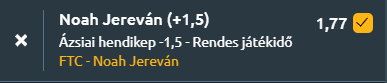 - Azt gondolom, hogy a bukik elmért oddszait ki lehet használni, csak nem a Fradit kell mínuszos hendiről nyeretni, hanem a Noaht plusszról! A Noah +1,5 gól hendikepes győzelem 1,77 ami önmagában is értékes, ha pedig a under 4,5 gólt is bekötjük, akkor 2,01-es szorzót kapunk.