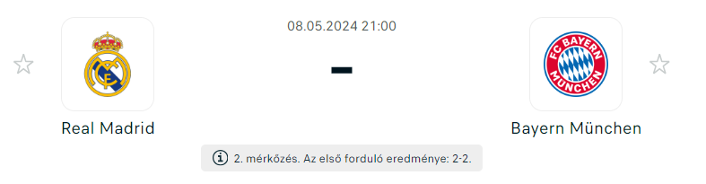 - A Bayern vezetett az odavágón, végig kézben tartották a meccset, de Vinicius Junior 83. percben szerzett góljával 2-2-re tudott egyenlíteni, így lélektani előny átkerült a Real Madrid oldalára. A Bajnokok Ligájában zsinórban 11 veretlen meccsből álló hihetetlen sorozatával, amely nyolc győzelmet és három döntetlent foglal magában, és amelybe beletartozik az aktuális Európa-bajnok Manchester City elleni drámai negyeddöntős győzelem is. A négy-, még lábon álló csapatból a Real Madridnak van a legnagyobb esélye a trófea elnyerésére a bukik szerint. A Real Madrid formája lenyűgöző ebben a szezonban, ráadásul a Bayern ellen hazai pályán is erős a mérlegük, a legutóbbi hat Bajnokok Ligája-találkozójukból ötöt megnyertek.