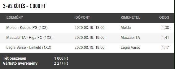 Ma kiválasztottam három meccset a BL-selejtezőkből, a három legbiztosabbnak tűnő összecsapást és csopokrba kötöttem, három HAZAI tippel. Minden továbbjutás egy fordulóban dől el, ezért sokkal elszántabb, harcosabb csapatokat láthatunk majd, nincs mód taktikázásra. Éppen ezért azok a párharcok, ahol az egyik fél jelentősen erősebb, valamint hazai pályán is lépnek fel, esélyesen eldőlnek a rendes játékidőben. A tippem tehát a Molde-, a Maccabi Tel Aviv és a Legia Varsó győzelmei.