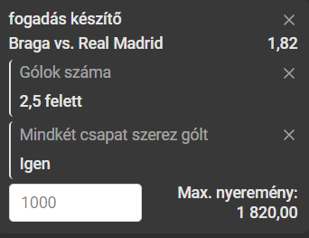 Egy Single Value Tipp következik, vagyis a sportfogadásban egy olyan értékelhető szorzó, amely single játékba küldés esetén is értéket hordoz magában! A Bajnokok Ligája csoportkörének harmadik fordulójában a portugál Braga a spanyol Real Madridot fogadja hazai pályán.