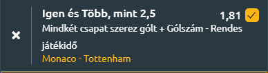 - Mire számíthatunk mindezek alapján? Az esélyeket vizsgálva mindkét oldalon hasonló problémák és erények figyelhetők meg. A Monaco és a Tottenham is veszélyes támadójátékot produkál, ugyanakkor védekezésben sebezhetőek, amit az utóbbi eredményeik is tükröznek. A statisztikák alapján egyik csapat sem hajlamos a gól nélküli mérkőzésekre, a Tottenham az elmúlt tizennyolc BL-találkozójából csak egyszer nem talált be, míg a Monaco hetvenkét európai meccsből mindössze egyet játszott 0–0-ra. Mindezek alapján pedig ma is egy gólgazdag, lüktető összecsapásra lehet számítani, ahol mindkét fél betalálhat.