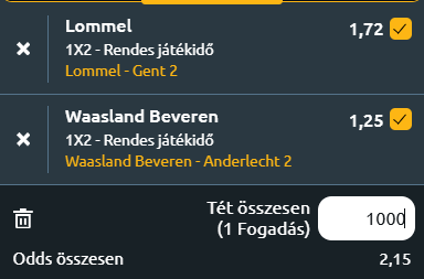 - Lommel SK – Gent 2: A hatodik Lommel SK és a tizedik Jong Gent csap össze a belga másodosztály mai játéknapján. A szezonban hat győzelem, négy vereség és öt döntetlen áll a hazaiak mögött, meccsenkénti két rúgott és 1,6 kapott gólos átlaggal. Az elmúlt öt mérkőzésük azonban hullámzást mutat egy győzelemmel, két vereséggel és két döntetlennel, miközben 2,2 gólt szereztek és 2,6-ot kaptak. Már régen nyertek hazai közönség előtt, ennek ma megvan a komoly esélye. A vendégek 1–3-as vereség után vannak, a KSC Lokeren ellen kaptak ki. A szezonban öt győzelem, hét vereség és három döntetlen a mérlegük, átlagosan 1,27 gólt rúgva és ugyanennyit kapva. A meccsen nyílt játék ígérkezik valószínűnek, miközben a formamutató és a győzelmi esélyek alapján a Lommel SK léphet pályára kedvezőbb helyzetben.
