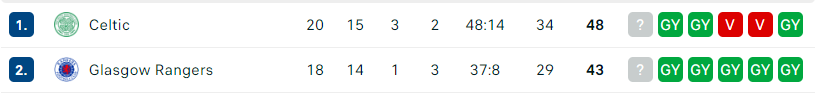 - A Rangers szurkolóinak minden oka megvan arra, hogy örüljenek csapatuk teljesítményének. A vendégek, ha megnyerik a még hátralévő két mérkőzésüket, akkor megelőzik a Celticet a tabella élén, feltéve, hogy péntek este a Celtic Parkban is veretlenek maradnak. A vendégek ráadásul Európában is jelentős bravúrt értek el azzal, hogy csoportjuk élén végezve bejutottak a 16 közé az UEFA Európa Ligában. A Rangers formáját mi sem jelzi jobban, minthogy legutóbbi vereségüket október elején szenvedték el, idegenben 2:1-re az Aris ellen. Emellett zsinórban öt bajnoki győzelmet arattak, 10:1-es gólkülönbséggel.