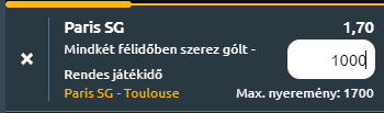 - A PSG az esélyese a Toulouse elleni párharcnak. A minőség, a tapasztalat és a forma az ő oldalukon áll, és bármi más, mint a párizsi csapat győzelme komoly meglepetés lenne. Egy rendkívül koncentrált hazai csapatra számíthatunk, amely már az első félidőben megszerezi a vezetést, és a másodikban sem állnak le a szórakoztatással. Mindkét félidőben szerez gólt a PSG csapata!