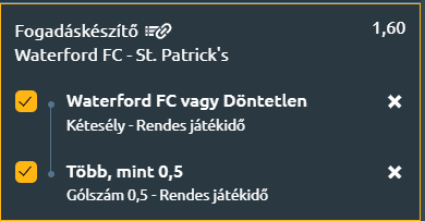 - A St Patrick's az utóbbi hetekben enyhe javuláson ment keresztül, de idegenbeli formájuk egész szezonban gyenge volt, míg a Waterford újoncként remekel egyelőre! A fogadáskészítővel hoztam a tippet. 1X, amire nagy esély van, plusz lesz gól a találkozón, amire szintén komoly sansz adódik!