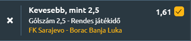 - A Bosnyák Kupa elődöntőjében az ország, háromból két legerősebb csapata, a Borac Banja Luka és a Sarajevo csap össze egy kiélezett rangadón. A hazaiak esélyei valamivel jobbak de a vendégegyüttest sem kell félteni. A tét hatalmas, a két gárda pedig alapvetően masszív hátsó alakzattal rendelkezik! A Sarajevo idei kupaszereplése során veretlen, három győzelemmel és egy döntetlennel, 1.75-ös rúgott és 0.5-ös kapott gólátlaggal, míg a Borac Banja Luka hibátlan négy győzelemmel, 2.5-ös gólszerzési mutatóval és mindössze 0.25 kapott góllal. Az elmúlt öt egymás elleni mérkőzésükön a Borac kétszer nyert, köztük a legutóbbi idegenbeli találkozón is (0-2), míg a Sarajevo csak egyszer diadalmaskodott. A közelmúlt statisztikái alapján mindkét csapat stabil védekezésre épít, hiszen a Sarajevo utóbbi öt meccsén csupán 0.6 gólt kapott, a Borac pedig még ennél is kevesebbet, mindössze 0.2-t. Emellett mindkét együttes az utóbbi tíz mérkőzésének többségén 2.5 gól alatti eredményt játszott, a Sarajevo hétszer, a Borac nyolcszor, ami szintén egy taktikus, kevés gólt hozó meccs irányába mutat.