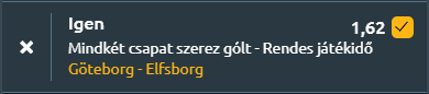 - Az Allsvenskan hétvégi fordulójában az utóbbi hetekben magára találó IFK Göteborg hazai pályán fogadja a formáját kereső Elfsborgot. Mindkét csapattól gól várható, hiszen a Göteborgi Kékek lendületesen szerepelnek az utóbbi hetekben, a legutóbbi öt bajnoki meccsükből négyet megnyertek, legutóbb például 3–1-re győzték le a Siriust hazai pályán, ami jól tükrözi támadójátékuk hatékonyságát. Bár az otthoni mérlegük vegyes, hét meccsen tíz pontot gyűjtöttek, ami nem kiemelkedő, de mutat némi stabilitást. A vendég Elfsborg ugyan nem nyert az elmúlt három bajnokin, beleértve a Hacken elleni 0–2-es vereséget, ám idegenben eddig tíz pontot szereztek hat meccsből, vagyis képesek hatékonyan szerepelni úton is. A legutóbbi győzelmük során például négy gólt szereztek a Halmstad ellen, ami azt jelzi, hogy ha megindulnak támadásban, gyorsan eredményesek lehetnek. A jelenlegi formák és statisztikák alapján tehát reálisnak tűnik, hogy mindkét oldalon gólt láthatunk.