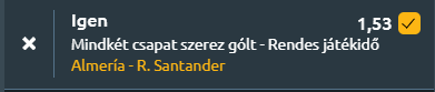 - A La Liga 2 mai játéknapján az Almería hazai körülmények között fogadja a Racing Santander csapatát. Mindkét együttes jó formában van, így izgalmas, gólokban gazdag összecsapásra számíthatunk. Lássuk a számokat! Az Almería jelenleg a La Liga 2 10. helyén áll. A szezonban eddig 1 győzelmet, 0 vereséget és 2 döntetlent könyvelhettek el, átlagosan 2,33 gólt szerezve és 2-t kapva mérkőzésenként. Legutóbbi találkozójukon 2-2-es döntetlent játszottak a Real Sociedad II-vel, míg egymás elleni múltjukban a Racing Santander ellen 2-0-s győzelmet arattak otthon. Az utóbbi öt egymás elleni meccsen Almería átlagosan 1 gólt szerzett meccsenként! A Racing Santander a La Liga 2 1. helyén áll, és eddig 3 győzelmet arattak, vereség és döntetlen nélkül, átlagosan 3,33 gólt szerezve és 1,33-at kapva mérkőzésenként. Legutóbbi találkozójukon 4-1-re győzték le a Ceuta csapatát. Az utóbbi öt egymás elleni meccsükön átlagosan 1,2 gólt szereztek meccsenként, ami szintén bizonyítja támadóerejüket. Mindkét csapat kiemelkedően eredményes az idei szezonban, Almería átlagosan 2,33, a Racing Santander pedig 3,33 gólt szerez mérkőzésenként. Az utóbbi meccseik és az egymás elleni múlt is azt mutatja, hogy képesek gólt szerezni. Várhatóan ma is megzörren mindkét háló!