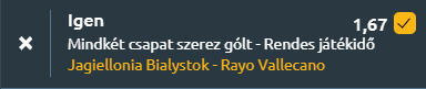- Kiegyenlített csatára készülhetünk a Konferencia Ligában, amikor a Rayo Vallecano vendégként lép pályára Jagiellonia Bialystok ellen. A Jagiellonia Bialystok a KL főtábláján eddig vegyes eredményeket ért el. A Hamrun Spartans ellen győztek, majd Strasbourg és Shkendija ellen döntetlent játszottak. Aztán hazai pályán azonban sikerült visszatalálniuk a győzelem útjára, Afimico Pululu góljával 1-0-ra verték a KuPS-t, és az elmúlt hét hazai mérkőzésükből hatot megnyertek, egyet veszítve. A Rayo Vallecano első európai szereplése óta eddig veretlen maradt a főtáblán, legyőzve Shkendiját és Lech Poznant, döntetlent játszva Hackennel, bár a Slovan Bratislava ellen elszenvedett vereség megszakította a sorozatot. Az utóbbi öt idegenbeli mérkőzésükből háromszor nem sikerült gólt szerezniük, de a hat európai fellépésük mindegyikén betaláltak, ez pedig a támadó erejüket mutatja. Parázs meccs várható, a Jagiellonia hazai pályás ereje és a Rayo európai támadó hátékonysága is erős. így gólgazdag, szoros mérkőzés várható, gólváltással.