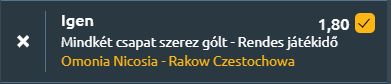 - Szintén a Konferencia Ligában vagyunk, ahol mindkét csapat számára létfontosságú a siker a továbbjutás szempontjából, így a csütörtöki összecsapás kiélezett és gólgazdag küzdelmet ígér. Omonia Nicosia a legutóbbi fordulóban 1-1-es döntetlent játszott az AEK Larnaca ellen, és jelenleg a 15. helyen áll a tabellán, miközben az idényben 7 győzelmet arattak, 2-szer kaptak ki, és 2 döntetlenük volt. Átlagosan 1,91 gólt szereznek meccsenként, miközben csak 0,45-öt kaptak, és az utolsó öt mérkőzésükön 4 győzelmet és 1 döntetlent hoztak, 2,0 gólos átlaggal. Raków Częstochowa a 3. helyen áll, legutóbb 0-1-es vereséget szenvedett a Zagłębie Lubin ellen, az idényben 8 győzelmet, 1 vereséget és 2 döntetlent jegyez, 1,73 gólos átlagot szerezve és 0,45-öt kapva. Az utolsó öt mérkőzésükön 4 győzelmet és 1 vereséget értek el, 1,6 gólos átlaggal. Mindkét csapat támadóformája stabil, és a legutóbbi mérkőzéseik alapján képesek betalálni, miközben a visszafogott formában lévő védelmek is gólképesek! A mérkőzésen valószínűleg mind Omonia Nicosia, mind Raków Częstochowa betalál, egy izgalmas, többgólos összecsapásra van kilátás.