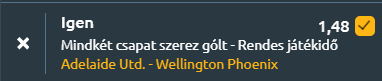 - Az A-League pénteki fordulójában az Adelaide United a Wellington Phoenix csapatát fogadja a Coopers stadionban. Az Adelaide a negyedik helyről várja a találkozót, miután legutóbb 1–1-es döntetlent játszott a Melbourne Victory otthonában, és három bajnoki óta veretlen. A csapat támadójátéka kifejezetten termékeny, 33 gólt szerzett, ami a liga második legjobb mutatója. Hazai pályán különösen erős, tíz meccsből 19 pontot gyűjtött, és hat egymást követő otthoni Wellington elleni mérkőzésen is veretlen maradt. A mérkőzései általában nyílt, gólokban gazdag csaták, az utóbbi tíz bajnokin mindig született legalább két találat. A Wellington nehéz helyzetben van, a tabella utolsó helyén áll, legutóbb 1–0-ra kikapott a Sydney FC ellen, és hat mérkőzés óta nyeretlen, ezalatt 17 gólt kapott. Védekezése egész idényben ingatag, már 39 gólt engedett, ugyanakkor idegenben az utóbbi négy meccséből hét pontot gyűjtött. A két csapat legutóbb 2–2-es döntetlent játszott, és az utóbbi hat egymás elleni mérkőzésen mindkét fél betalált. Mindkét csapattól várható gól, mert az Adelaide támadójátéka rendkívül eredményes, míg a Wellington sok gólt kap, ugyanakkor idegenben is rendszeresen betalál.