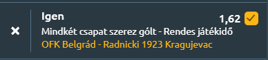 - A szerb élvonal mai játéknapján a Az OFK Beograd csapata hazai körülmények között fogadja a Radnicki Kragujevac alakulatát. Az OFK Beograd az utolsó öt egymás elleni mérkőzésből háromszor győzött, kétszer veszített, átlagosan 2 gólt szerzett meccsenként, a legutóbbi találkozójukon 0-2-re nyertek idegenben. A Radnicki Kragujevac az utolsó öt head-to-head meccsből kétszer győzött, átlagosan 1,4 gólt szerzett. A mostani szezonban az OFK Beograd 9 győzelmet, 10 vereséget és 6 döntetlent gyűjtött, 1,28 gólt szerezve és 1,32-t kapva meccsenként, míg a Radnicki Kragujevac 7 győzelem, 9 vereség, 8 döntetlen mellett 1,21 gólt szerzett és 1,46-ot kapott átlagosan. Az utolsó öt mérkőzésükön az OFK Beograd 2 győzelmet, 1 vereséget és 2 döntetlent könyvelhetett el, 1 gólt szerezve és 0,6-ot kapva, a Radnicki Kragujevac 1 győzelem, 2 vereség és 2 döntetlen mellett 1,4 gólt szerzett és 1,6-ot kapott meccsenként. Szoros, kiegyenlített meccsen gólváltásra van kilátás.