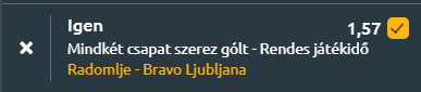 - Radomljéban forró hangulatú összecsapás várható, ahol a tabella középmezőnyének két csapata próbálja meg bebiztosítani helyét az élboly mögött. A mérkőzés esélyei kiegyenlítettek, de a számok alapján a Bravo felé billen a mérleg. A Radomlje az utóbbi öt meccsén egy győzelmet, egy vereséget és három döntetlent játszott, miközben 1,8 gólt szerzett és 2,0-t kapott. A Bravo két győzelemmel és három vereséggel érkezik, átlagban 1,0 gólt lő és 1,6-ot kap. A tabellán mindössze egy hely választja el őket: a Radomlje a 6., a Bravo az 5. pozíciót foglalja el. A szezon egészét nézve a hazaiak 9 győzelemnél, 8 vereségnél és 6 döntetlennél tartanak, 1,52-es gólátlaggal és 1,74-es kapott gólátlaggal. A Bravo 10 győzelmet, 10 vereséget és 4 döntetlent jegyez, 1,71-es rúgott és 1,75-ös kapott gólátlaggal. A legutóbbi meccseik is árulkodók: a Radomlje 2–2-t játszott Dekanival, míg a Bravo 1–0-ra verte Celjét. A közös múlt sem egyértelmű: az utolsó öt egymás elleni találkozón két-két győzelem és egy döntetlen született. A számok és a formák alapján a Bravo minimális előnyben van, de a Radomlje hazai pályán bármikor képes meglepetést okozni, így egy kiélezett, nyílt mérkőzés várható. Mindkét csapattól azért várható gól, mert mindkét oldalon magas a rúgott gólátlag, miközben a védekezés mindkét csapatnál sebezhető.