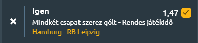 - Kiegyenlített esélyek mellett csap össze a középmezőnyben álló Hamburger SV és az európai helyekért harcoló RB Leipzig. A HSV a 11. helyről várja a folytatást, mérlege 6 győzelem, 8 vereség és 8 döntetlen, meccsenként 1,14 gólt szerez és 1,45-öt kap. Az utóbbi öt fordulóban veretlen maradt (2 győzelem, 3 döntetlen), ez idő alatt 1,6 gólt átlagolt, miközben 1-et engedett. Legutóbb a Mainz ellen 1–1-et játszott. A Leipzig az ötödik pozícióban áll, 12 győzelemmel, 6 vereséggel és 5 döntetlennel, támadásban 1,91-es, védekezésben 1,39-es átlaggal. A Dortmund elleni 2–2 után az utóbbi öt meccséből csak egyet nyert meg, és 1,8 gólt kapott átlagban. Az egymás elleni mérleg a lipcseiek fölényét mutatja: az utolsó öt találkozóból négyet megnyertek, a legutóbbi összecsapáson 2–1-re győztek, és ezen időszakban 2,4 gólt szereztek meccsenként. A statisztikák is élénk meccset ígérnek: 56% az esélye a gólváltásnak és ugyanennyi a 2,5 gól feletti kimenetelnek, ráadásul mindkét csapat legutóbbi tíz meccséből héten betalált mindkét fél. Azért várható gólváltás a meccsen, mert a közelmúltban mindkét együttes mérkőzésein rendszeresen mindkét csapat eredményes volt!