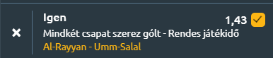 - Ez már Katar, ahol az Al Rayyan a legutóbbi 1–1-es döntetlen után továbbra is erős támadójátékkal rendelkezik, a szezonban 1.95 gólt szerez meccsenként, és az utóbbi tíz fellépéséből hétszer is 2.5 gól fölé ment. Az Umm-Salal SC gyengébb formában van, de a 3–2-es vereség és a szezonbeli 1.8-as gólátlag azt mutatja, hogy képes veszélyt teremteni, még ha a 2.5-ös kapottgól-átlag sokat ront is a helyzetén. A két csapat egymás ellen rendre az Al Rayyan fölényét hozta, négy győzelemmel és 3.0-s gólátlaggal, míg az ellenfél 1.2-es átlaggal válaszolt. A formák alapján mindkét oldalon akad támadóerő, az Al Rayyan az utóbbi öt meccsen 1.6-os, az Umm-Salal SC 2.0-s gólátlagot hozott. A 64%-os BTTS-esély és a gyakori gólzápor egyaránt a nyílt játék felé mutat.