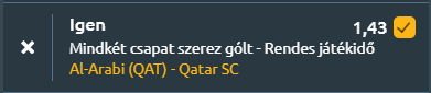 - A dohai Grand Hamad Stadionban kiegyenlített, mégis gólgazdag mérkőzés várható. Lássuk a számokat! A hazaiak az ötödik, a vendégek a hetedik helyen állnak de mindkét csapat gólképes formát mutat. Az elmúlt tíz mérkőzés tapasztalata gólváltást ígér, hiszen az Al-Arabi SC nyolc, a Qatar SC hét alkalommal játszott BTTS-t. Az egymás elleni összecsapások is gólgazdagok voltak, az Al-Arabi SC 2,8-as, a Qatar SC 1,0-s átlagot produkált. A legutóbbi találkozójuk 1-5-ös végeredménnyel zárult, míg a legutóbbi fordulóban az Al-Arabi SC 0-2-re nyert Al Shahaniya ellen, a Qatar SC pedig 1-4-re maradt alul az Al Wakrah ellen. A szezonbeli átlagok is a támadó játékot igazolják, az Al-Arabi SC 1,84, a Qatar SC 1,58 gólt szerez meccsenként, miközben az utóbbi öt találkozón a hazaiak 1,4-et, a vendégek 2,0-t. A számok és a tendencia alapján mindkét csapat gólt szerez kimenetel erősen várható.
