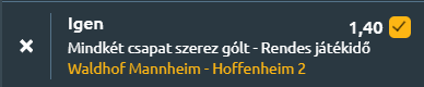 - Maradjunk még egy meccs erejéig a statisztikailag gólgazdag német harmadosztályban. A Waldhof Mannheim a 10. helyen fogadja a Hoffenheim II-t, amely a 15. pozícióból érkezik a Carl-Benz-Stadionba. A csapatok formája és az egymás elleni mérlege mind a BTTS mellett szólnak. A Waldhof Mannheim az utolsó mérkőzésén 1-1-et játszott az 1860 München ellen, míg a Hoffenheim II 3-5-re verte az Erzgebirge Aue-t, mindkét együttes remek támadóformában van. Az elmúlt tíz mérkőzés alapján a Waldhof Mannheim hét alkalommal látott több mint 2,5 gólt, míg a Hoffenheim II nyolcszor, és ugyanennyi mérkőzésen mindkét csapat betalált, a Mannheim hétszer, míg a Hoffenheim II nyolcszor. Az idénybeli átlagok is ezt támasztják alá, a Waldhof Mannheim 1,61 gólt szerzett és 1,77-et kapott meccsenként, a Hoffenheim II 1,87-et ütött be és 1,84-et kapott. Az utolsó öt meccsen a Mannheim 1,4 gólt ért el és 1,6-ot kapott, a Hoffenheim II pedig 2,0-t szerzett és ugyanennyit kapott. Mindezek alapján logikus következtetés, hogy a találkozón mindkét csapat képes betalálni!