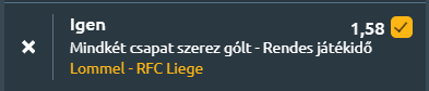 - A belga másodosztály élén álló Lommel SK hazai pályán fogadja a közvetlen üldöző RFC Liège együttesét, ahol a hazaiak számítanak esélyesebbnek, de a Liege is bőven jó lehet legalább egy gólra. A Lommel legutóbb 2–1-re kikapott a Beerschot ellen, és az utóbbi öt mérkőzésén két győzelem mellett két vereséget és egy döntetlent jegyzett, meccsenként 1,8 gólt szerezve és 1,6-ot kapva. Szezonja összességében támadó felfogású, 1,84-es gólátlaggal, ugyanakkor védekezésben hagy kívánnivalót maga után, 1,44-es kapott gólátlaggal. Az RFC Liège ezzel szemben győzelemmel érkezik, legutóbb 2–1-re múlta felül az Eupent, és az elmúlt öt találkozóján háromszor nyert, kétszer kikapott, döntetlent nem játszott, miközben 1,2 gólt szerez és 1,4-et kap átlagban. Az idényben kiegyensúlyozottabb képet mutat, 1,38-as rúgott és 1,22-es kapott gólátlaggal. Az egymás elleni mérleg inkább a vendégeknek kedvez, az utóbbi öt találkozóból hármat az RFC Liège nyert meg, egy döntetlen és egy Lommel-siker mellett, és a legutóbbi összecsapáson is 1–0-ra diadalmaskodtak. Mindkét csapat rendszeresen szerez és kap gólokat, különösen a Lommel mérkőzései hajlanak a nyílt játék felé, és a statisztikai esélyek is a gólváltás irányába mutatnak.