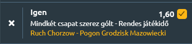 - Lengyel testvéreinkhez utazunk, ahol a másodosztály mai játéknapján a Ruch otthon fogadja a Pogon Grodzisk Mazowiecki alakulatát. A Ruch legutóbb 1–1-re végzett a Wisla Kraków ellen, a Pogon pedig 2–0-ra kikapott a Pogon Siedlcétől. Az egymás elleni mérleg a hazaiak felé billen, az utóbbi három találkozóból egyet a Ruch nyert, kettő döntetlen lett, miközben a Ruch átlagban 2,3, a Pogon pedig 1,3 gólt szerzett meccsenként. A tabellán a Ruch a 7., a Pogon a 10. helyen áll. A szezonstatisztikák alapján a Ruch 11 győzelemmel, 8 vereséggel és 10 döntetlennel 1,45 gólt lő és 1,38-at kap átlagban, míg a Pogoń 11 győzelemmel, 8 vereséggel és 9 döntetlennel 1,61 lőtt és 1,5 kapott gólt hoz. A formamutató szerint a Ruch az utóbbi öt meccsén 1,2 gólt szerzett és 1,4-et kapott, míg a Pogon mindössze egyszer nyert, négyszer kikapott, 0,8-as gólátlaggal és 2,4 kapott góllal. A két csapat kiegyenlített támadójátéka és a Pogon gyenge védelmi-formája egyaránt azt jelzi, hogy mindkét fél betalálhat.