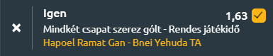 - Búcsúzóul pedig Izrael, ahol gyakran lőnek, futballmeccsen gólt is. A Hapoel Ramat Gan és a Bnei Yehuda a Lod Municipal Stadionban csap össze, és két élcsapat találkozik egymással. A Hapoel Ramat Gan legutóbb 3–1-re verte a Hapoel Haderát, míg a Bnei Yehuda 1–0-s győzelmet aratott a Maccabi Herzliya ellen. Az egymás elleni mérleg kiegyenlített, az utóbbi öt találkozóból kettőt a Hapoel Ramat Gan nyert, egyet a Bnei Yehuda, két döntetlen mellett, miközben a hazaiak 1,6, a vendégek 1,2 gólt szereztek meccsenként. A tabellán a Hapoel Ramat Gan az első, a Bnei Yehuda pedig a második helyen áll. A szezonstatisztikák alapján a hazaiak 14 győzelemmel, 9 vereséggel és 7 döntetlennel 1,6 gólt lőnek és 1,2-t kapnak átlagban, míg a vendégek 12 győzelemmel, 10 vereséggel és 8 döntetlennel 1,13 lőtt és 1,23 kapott gólt hoznak. A formamutató szerint a Hapoel Ramat Gan négy győzelemmel és egy vereséggel érkezik, 2,4-es gólátlaggal és 1,6 kapott góllal, míg a Bnei Yehuda két győzelemmel, egy vereséggel és két döntetlennel hangolt, 1,2-es gólátlaggal és ugyanennyi kapott góllal. A két csapat kiegyenlített támadójátéka és az egymás elleni gólátlagok egyaránt azt jelzik, hogy mindkét fél jó eséllyel betalál.