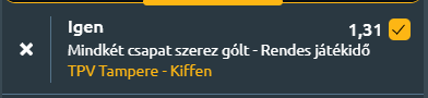 - A finn harmadosztályú bajnokságban A TPV hazai pályán, Tamperében fogadja a Kiffen csapatát. Mindkét gárda vereség után van, így most a javítás és a pozíciójuk megerősítése a cél. A TPV jelenleg a tabella 3. helyén áll, erős szezont futva,: 14 győzelmet arattak, 4-szer kaptak ki és 2 döntetlent játszottak. A csapat támadójátéka kimagasló, hiszen mérkőzésenként átlagosan 2,85 gólt szereznek, miközben 1,25-öt kapnak. Formájuk az utóbbi időben szintén figyelemre méltó, hiszen legutóbbi öt találkozójukból négyet megnyertek és csak egyszer kaptak ki. A legutóbbi meccsükön 2–0-ra alulmaradtak a HJS Akatemiával szemben, összességében meggyőző teljesítményük alapján hazai pályán komoly esélyekkel várhatják a találkozót. A Kiffen a tabella 5. helyén áll, de jóval hullámzóbb teljesítményt mutat, 9 győzelem, 10 vereség és mindössze 1 döntetlen szerepel a mérlegükben. Góltermelésük kiegyensúlyozott, 1,85-ös átlaggal, ugyanakkor védekezésük sebezhető, hiszen 1,65 gólt kapnak mérkőzésenként. Legutóbb a HPS ellen maradtak alul 3–2-re, ami jól mutatja, hogy találkozóik rendre gólgazdagok. A két csapat legutóbbi 10-10 meccséből 7-szer esett legalább három találat. A TPV támadógépezete kiváló formában van, míg a Kiffen bár bizonytalanabb, rendszeresen szerez gólokat és kap is. A statisztikák alapján mindkét oldalon várható gól, a mérkőzés pedig nagy valószínűséggel látványos, gólgazdag csatát hoz majd Tampere-ben.