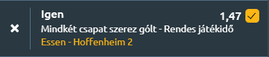 - A német harmadik vonalba látogatunk, ahol a középmezőnyben elhelyezkedő Rot-Weiss Essen fogadja a dobogó közelében álló Hoffenheim II csapatát. A Rot-Weiss Essen a forduló előtt a 3. Liga 9. helyén állt, és eddig három győzelmet, két vereséget, valamint három döntetlent jegyez a szezonban. A csapat támadójátéka aktív, mérkőzésenként átlagosan két gólt szereznek, ugyanakkor ugyanennyit kapnak is. Legutóbb szeptember 27-én súlyos, 6-1-es vereséget szenvedtek a Waldhof Mannheim ellen. Az elmúlt tíz mérkőzésükből nyolcszor fordult elő, hogy mindkét csapat betalált! A Hoffenheim II jelenleg a bajnokság 4. helyén áll, és eddig négy győzelmet, két vereséget, valamint két döntetlent ért el. A csapat támadójátéka még eredményesebb, mérkőzésenként átlagosan 2,25 gólt szereznek, miközben 1,38-at kapnak. Mindkét együttes átlagosan két gólt szerez mérkőzésenként, és rendszeresen kapnak is találatokat. Az Essen legutóbbi súlyos veresége, valamint a Hoffenheim II stabil támadójátéka tovább növeli annak valószínűségét, hogy a találkozón mindkét fél eredményes lesz.