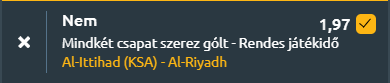 - A Saudi Pro League mai játéknapján a címvédő Al Ittihad fogadja az idegenben gyengélkedő Al Riyadh együttesét, ahol mindkét csapat számára fontos pontok forognak kockán. Az Al Ittihad nyolc bajnokin 11 pontot szerzett három győzelemmel, két döntetlennel és három vereséggel, miközben 1.9 gólt lő és 1.8-at kap átlagosan, ám ötmeccses nyeretlenségi sorozattal érkezik, amely során tíz gólt is kapott, így támadásban ugyan eredményes, de védekezésben bizonytalan. Ezzel szemben az Al Riyadh 12 ponttal, egy győzelemmel és két döntetlennel építette fel legutóbbi hárommeccses veretlenségét – 1–0-s sikerrel és két 1–1-es döntetlennel –, viszont idegenben továbbra sem tudott nyerni, négy meccsből csupán egy pontot gyűjtött. A kevésbé hatékony vendégtámadójátékot jelzi, hogy eddigi nyolc bajnokiján mindössze kilenc gólt szerzett, és ritkán jut 1.5 fölé. Emellett az egymás elleni találkozók is őket sújtják, hiszen az utóbbi négy meccsből háromszor sem tudtak betalálni az Al Ittihadnak. Összességében tehát, a vendégek idegenbeli gyenge formája, alacsony gólszámai és a korábbi eredmények azt vetítik előre, hogy nem várható mindkét csapattól gól ezen a mérkőzésen.