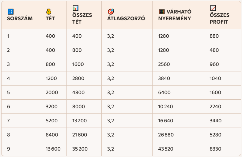 - A fogadási szisztéma pedig a következő. A BANKROLLMENEDZSMENT és a FIBONACCI-STRATÉGIA együttes használatával kell haladnunk. Ez a cikk 1.23%-os alaptétet mutat be (400-35.200), ebben az esetben 8 fordulót lehet menni, a szorzónak a korábban taglalt FIBONACCI stratégiás cikk szerint 3,00 fölött kell lennie! Az utolsó 9. fogadásnak be kell jönnie, vagy elbukjuk a bankunkat. Lássunk egy fogadási sorozatot béldákkal a Tippmixpróról!