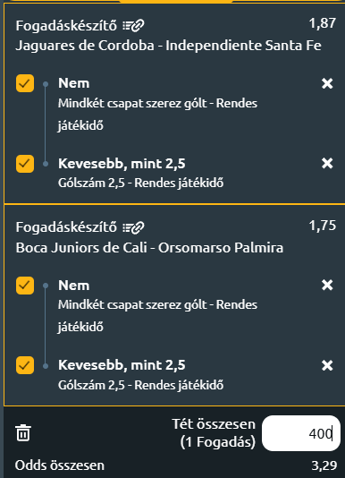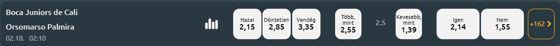 Mindezt ki lehet listázni a Tippmixprón úgy, hogy mindhárom adatot egyszerre lássuk. A 2026.02.18-i két-, az általam felvázolt kitételeknek tökéletesen megfelelő, kolumbiai bajnoki meccs! Ez a kép a kilistázás lehetőségét mutatja meg! Az első mérkőzésen 1,63 a BTTS/NEM szorzója, de ez még belefér, ráadásul a fent látható táblázatban ott van, hogy a kolumbiai foci gyakran kevés gólos meccseket hoz!