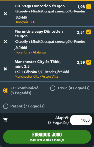 - Ha pedig mindhárom meccsbe beletrafálunk, akkor három 4-szeres nyereményünk lesz (2,0-val számolva), ami a feltett 3000 forint tétre 12.000 forintot jelent.
