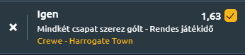 - Mindkét csapattól várható a gól, mivel a Crewe jelenleg nagyon jó formában van, és támadásaik hatékonynak bizonyultak, különösen hazai pályán, ahol az utóbbi meccseken rendre eredményesek voltak. Shilow Tracey, aki legutóbb duplázott, lendületben van, és várhatóan vezető szerepet vállal a támadásokban. Ezzel szemben a Harrogate, bár hullámzó formát mutat, idegenben is képes volt gólt szerezni, és a Liverpool U21 elleni döntetlen is azt mutatja, hogy van esélyük a gólra. Védekezésük ugyanakkor sebezhető, ami további lehetőségeket adhat mindkét csapat számára a gólszerzésre.