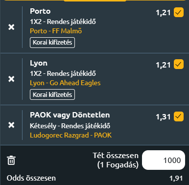 - Lyon - Go Ahead Eagles: A Lyon egy bajnoki vereség után érkezik az Európa-liga mai meccsére, ahol eddig kiemelkedően teljesí! 12 pontot gyűjtött, egyetlen botlását a Betis elleni idegenbeli 2–0 jelentette, amit egy 6–0-s Maccabi Tel-Aviv elleni diadallal korrigált. Corentin Tolisso mesterhármast szerzett, a csapat pedig hazai pályán eddig mindkét európai mérkőzésén 2–0-ra győzött Salzburg és Basel ellen. A Go Ahead Eagles újoncként várja harmadik idegenbeli fellépését. Meglepetésszerű győzelmet arattak a Panathinaikosz otthonában, majd otthon az Aston Villát is legyőzték 2–1-re. Hat pontjuk ugyan még nem elég a top 24-hez, de kedvező eredményekkel akár a 15. helyig is előreléphetnek. A lyon-i veretlenség és a hazai fölény alapján a franciák várhatóan magabiztosan nyernek, és megtartják első helyüket.